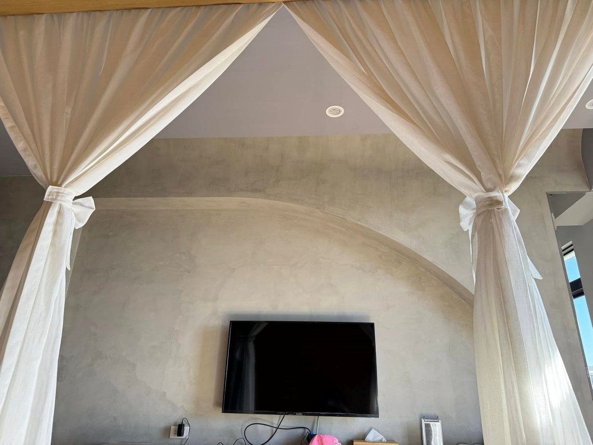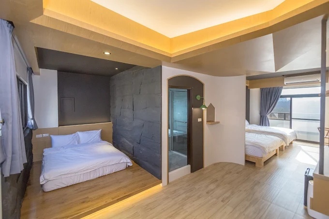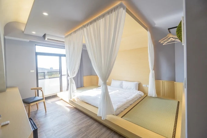 第一天住的是「海景加大雙人房」。一進門就看到大片海景窗,陽光整個灑進來,房間色調是奶油與木質調的侘寂風,乾淨、柔和又安靜。榻榻米式的床搭配浪漫帳,一秒就有在峇里島渡假的錯覺。浴室是乾濕分離設計,水壓穩、熱水夠,設備新穎又非常乾淨。