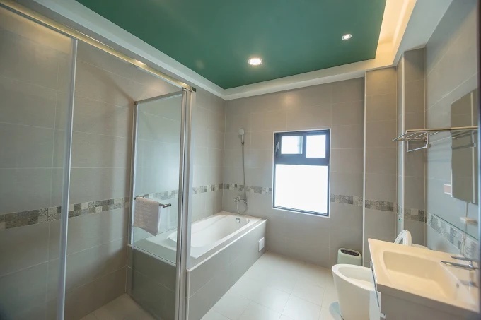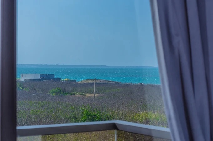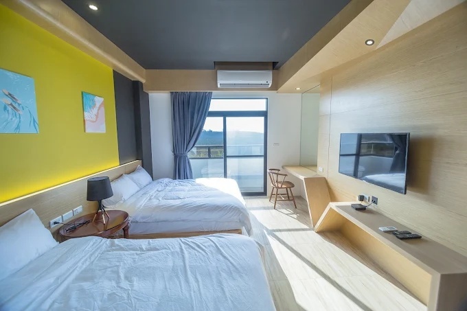 第二天換到「海景四人房」。空間更大、有兩張床,窗外依舊是那片藍海。最喜歡的是房內有一個浴缸,白天的陽光從大面窗灑進來,整個房間溫柔得像雜誌裡的畫面。主人也貼心裝了遮光效果很好的窗簾,早上太陽再亮也能睡到自然醒。