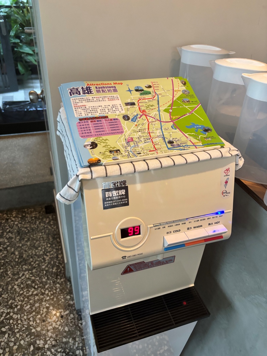 一樓有簡單的桌椅讓你可以稍做休息喝杯水,如果帶食物回來也建議在這邊食用比較舒適,飲水機上提供了景點地圖以及包車旅遊的資訊,即使不開車也可以盡情暢遊想去的景點。